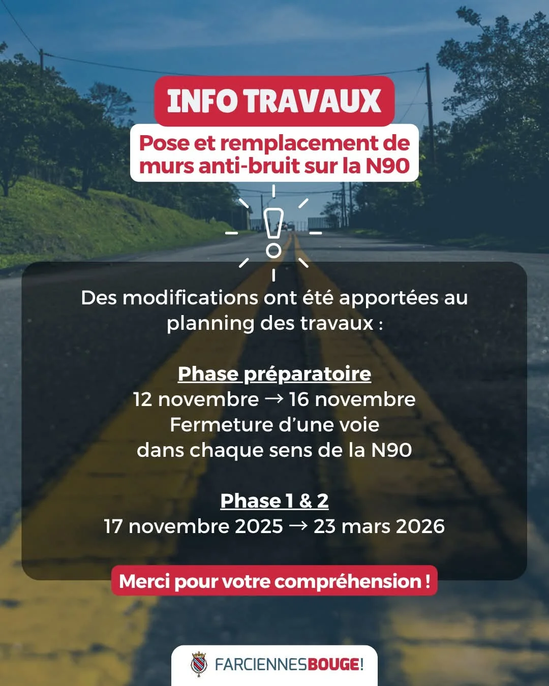 Le planning des travaux sur la N90 a été mis à jour. Les interventions concernent principalement la pose et le remplacement des murs anti-bruit le long de la route, visant à améliorer la qualité de vie des riverains.