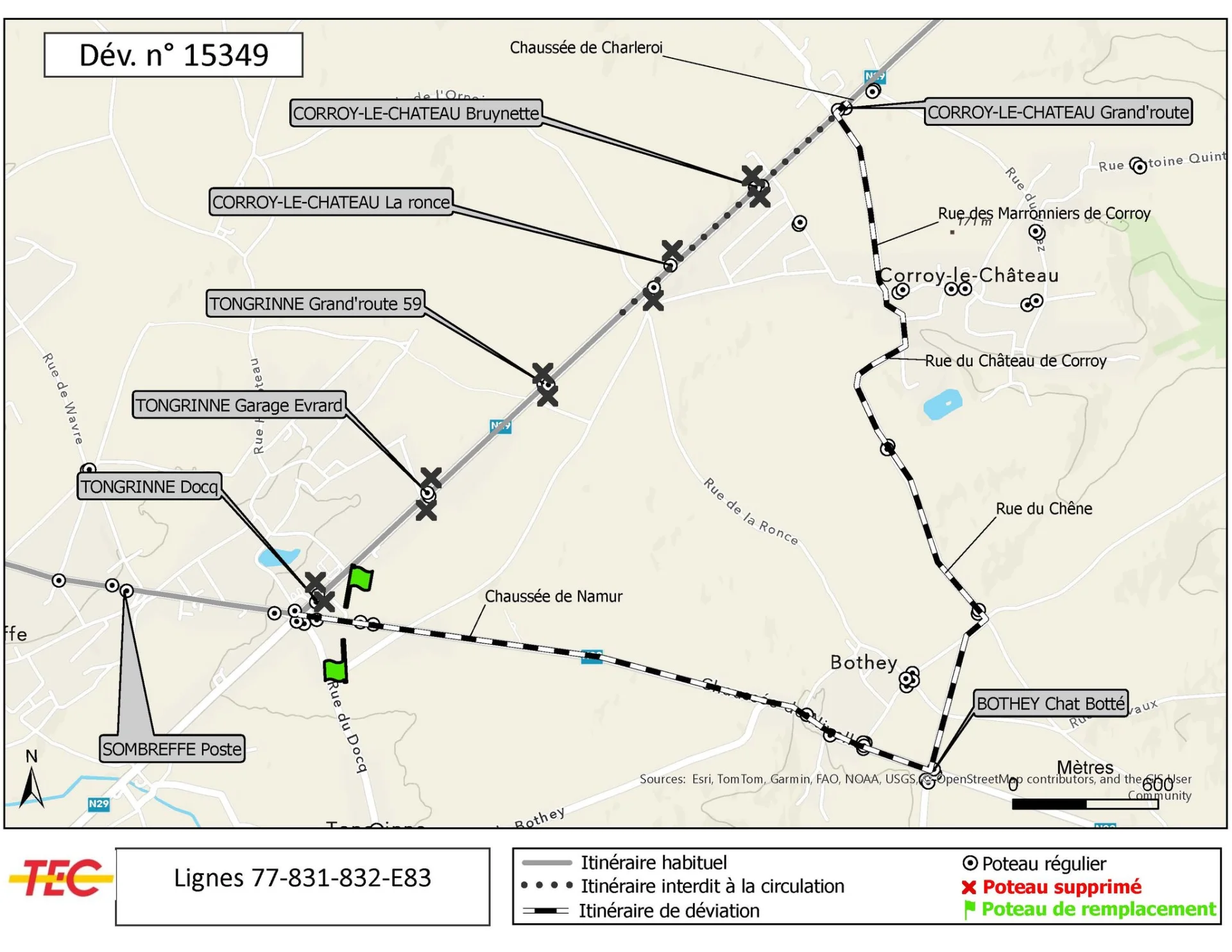 Le TEC annonce par ailleurs une déviation pour les lignes 77, 831, 832 et E83. Plusieurs arrêts seront temporairement supprimés : Docq, Garage Evrard, Grand’route 59, La Ronce et Bruynette. Des informations complémentaires sont disponibles sur le site www.letec.be.