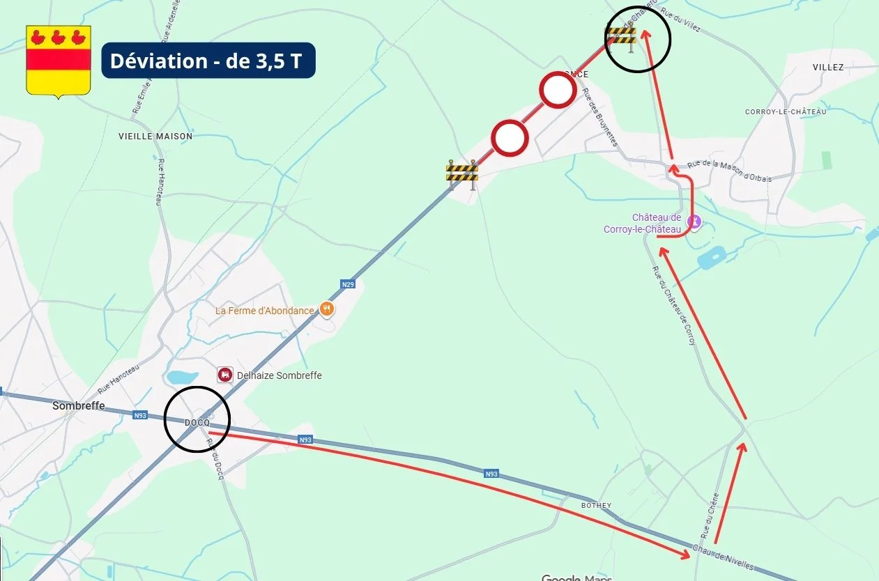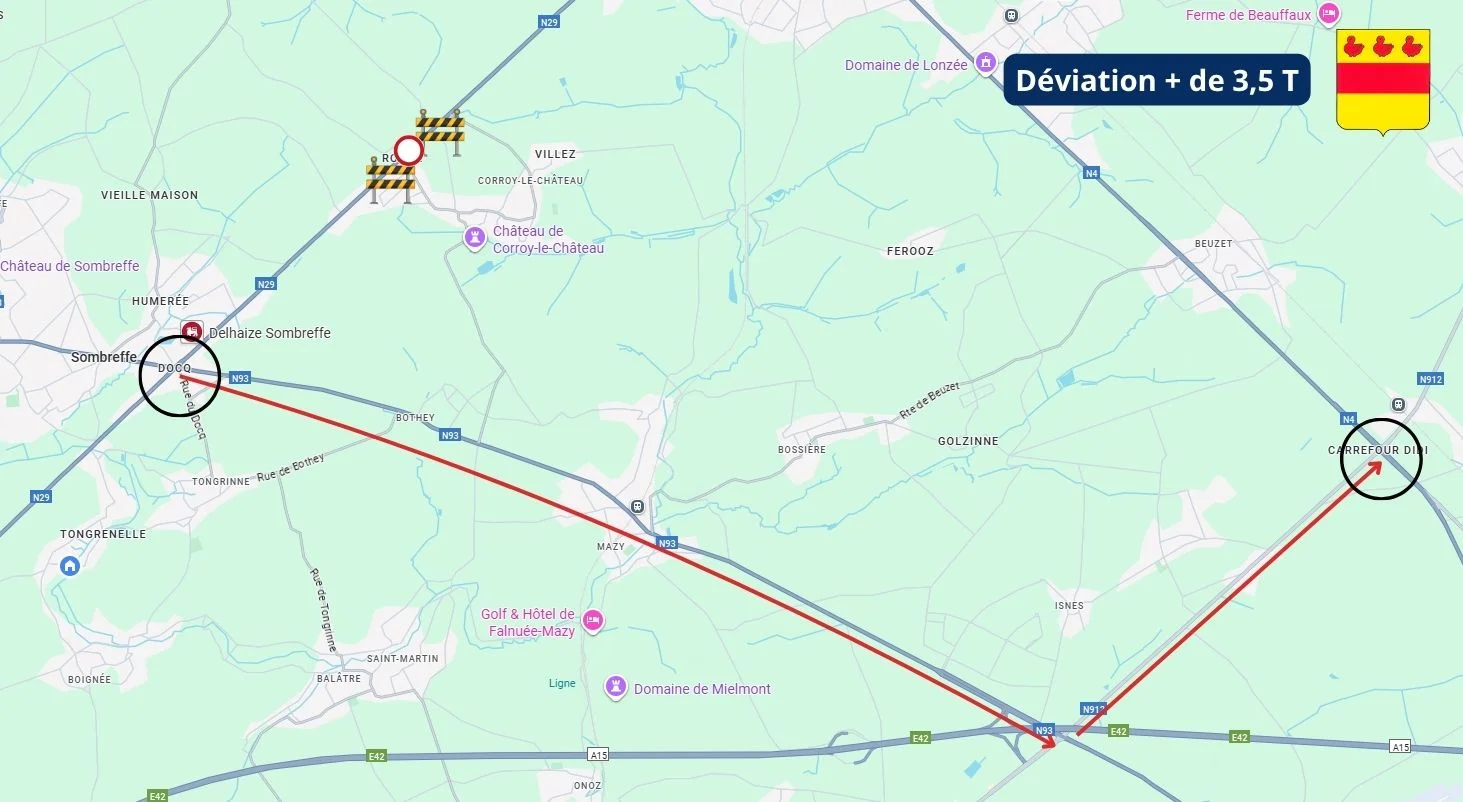 Poids lourds de plus de 3,5 tonnes : déviation via la N93 (chaussée de Namur/Nivelles), la N912 (route d’Eghezée) et la N4 (chaussée de Namur).