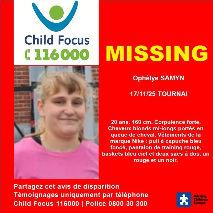 Ophélye Samyn, âgée de 20 ans, a été vue pour la dernière fois à Tournai le 17 novembre 2025. Sa famille et les autorités s’inquiètent de son absence et multiplient les recherches pour la localiser.