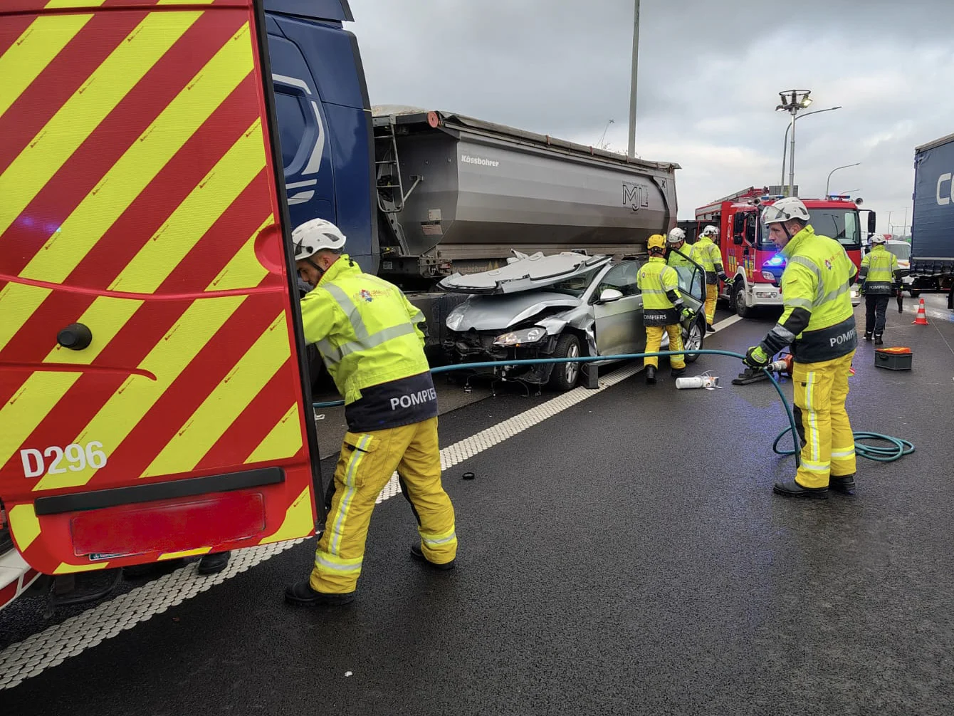 Les pompiers du peloton II/2 sont rapidement intervenus pour une double désincarcération. Face à la violence du choc, les équipes ont procédé au dépavillonnage complet – découpe totale du toit – d’un premier véhicule, et au dépavillonnage partiel de l’avant du second. Au total, trois personnes ont dû être extraites des habitacles déformés.