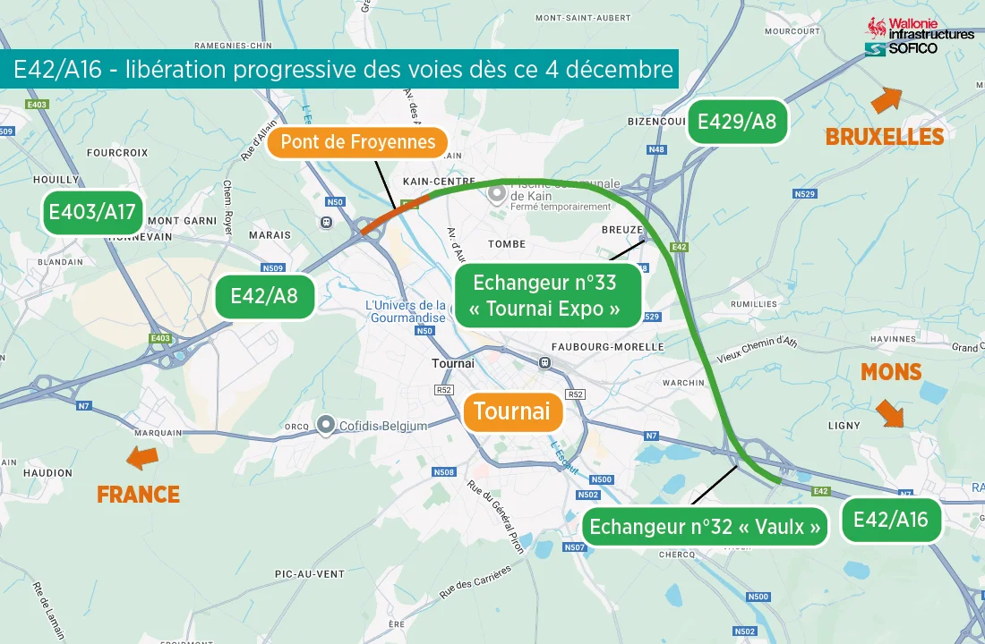 Les travaux de reconstruction de l’autoroute E42/A16, entre Tournai (séparation E42/A8-E42/A16-E429/A8) et l’échangeur n°32 « Vaulx », en direction de Mons, touchent à leur terme. Initialement prévues pour démolir et reconstruire les dalles de béton sur 50 cm, certaines sections ont nécessité un remplacement jusqu’à 80 cm de profondeur, incluant fondations et sous-fondations, entraînant un léger retard.