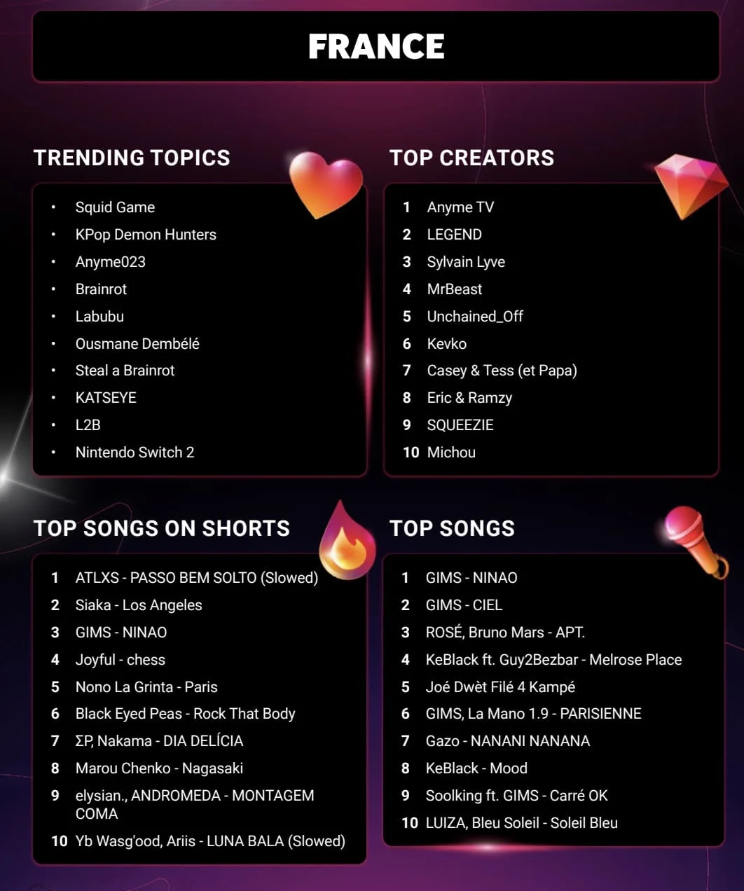 Dans la catégorie des musiques les plus utilisées sur YouTube Shorts, GIMS s’offre la première place. Ses titres, largement repris dans les vidéos courtes, confirment une influence constante sur les formats viraux.