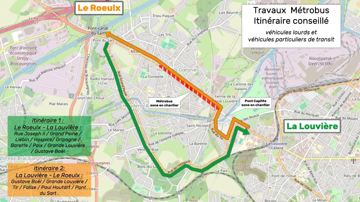 Vers Le Roeulx : circulation maintenue via Gustave Boël → Grande Louvière → Tir → Falise → Paul Houtart → Pont du Sart.