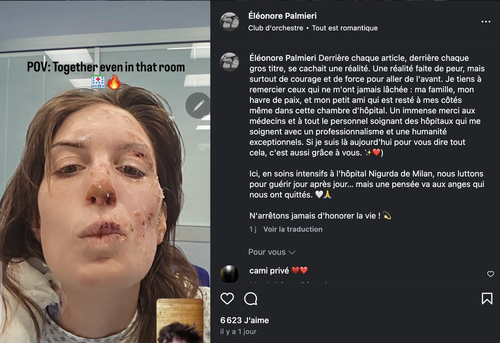La publication est accompagnée de plusieurs images contrastées : des souvenirs heureux partagés avec son compagnon avant la tragédie, mais aussi des photos prises à l’hôpital, montrant les séquelles visibles de l’incendie, notamment son visage et ses mains lourdement bandés.