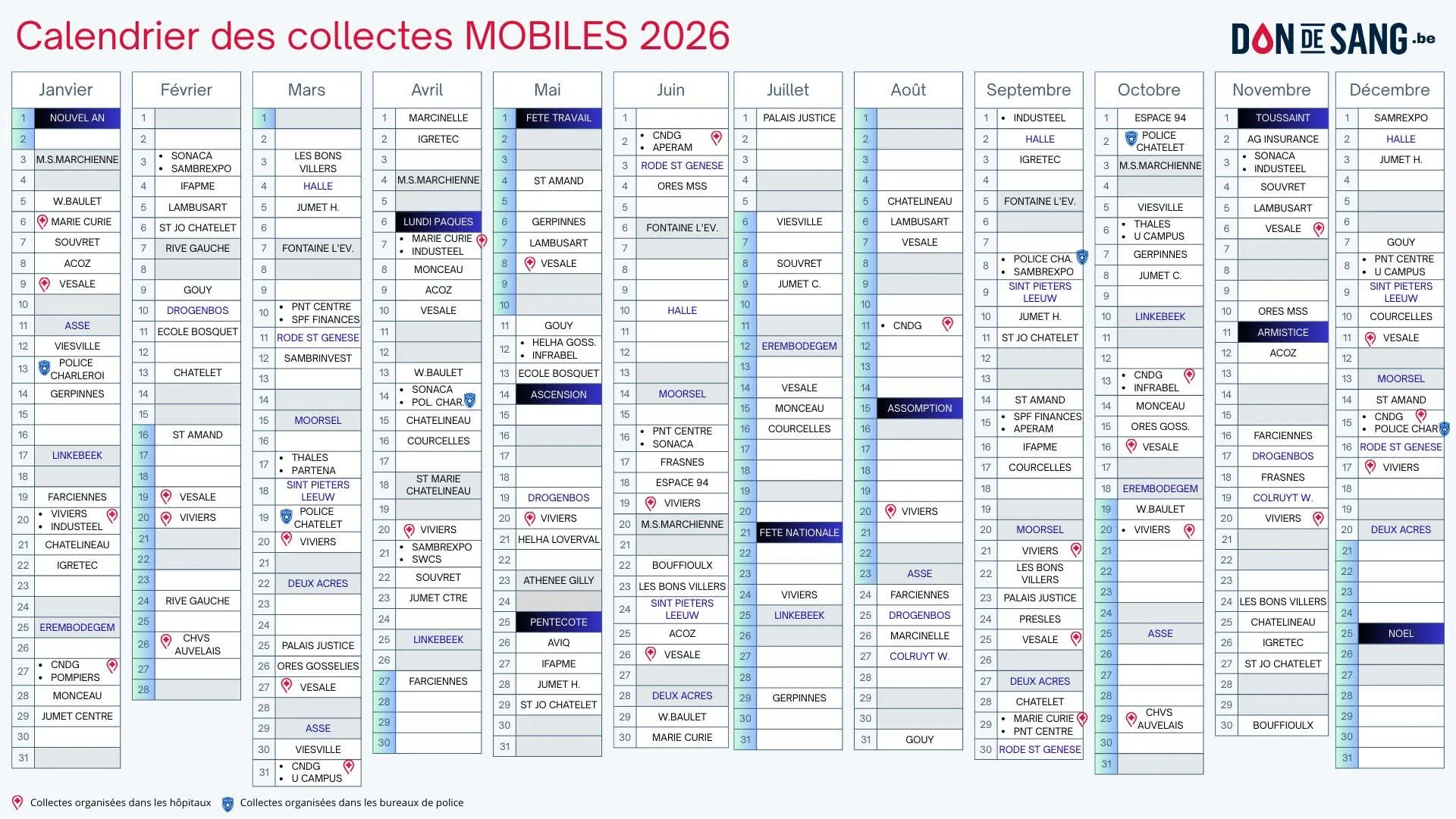 En parallèle, des collectes mobiles sont organisées dans différents quartiers pour faciliter l’accès au don. Les informations détaillées sont disponibles sur le site officiel : www.dondesang.be. Les organisateurs invitent le public à consulter régulièrement le calendrier, car des modifications peuvent survenir au cours de l’année.