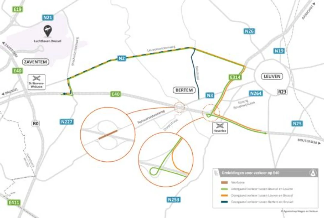 La situation atteindra son point critique du samedi 31 janvier à 20h au dimanche 1er février à 14h, période durant laquelle l’E40 sera totalement fermée à la circulation dans les deux sens à Bertem. Les bretelles d’accès et de sortie 22 seront également fermées. Une déviation obligatoire sera mise en place via la N227 (Mechelsesteenweg) et la N2 (Leuvensesteenweg / Brusselsesteenweg), entre les échangeurs 21 《Sterrebeek (E40)》 et 17 《Winksele (E314)》.