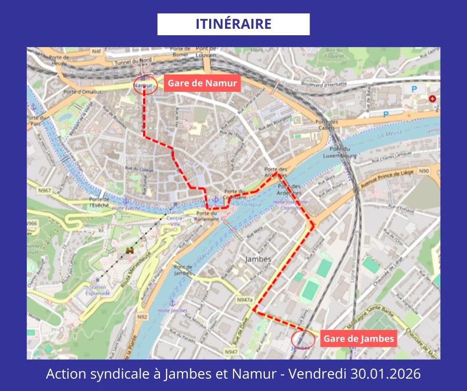 Le rassemblement est prévu à 10h30 à la Gare de Jambes (rue de la Gare Fleurie). Le cortège quittera ensuite Jambes vers 11h00 pour emprunter l’itinéraire suivant : Avenue Jean Materne, Avenue Bovesse, Rond-point Joséphine Charlotte, Pont des Ardennes, Boulevard Isabelle Brunell, Pont de France, Rond-point du Grognon, Rue du Pont, Rue de Marchovelette, Place de l’Ange, Rue Saint-Jacques, Rue de Bruxelles, Rue Godefroid, jusqu’à la Place de la Station à Namur, où le cortège devrait se dissoudre vers 13h00.