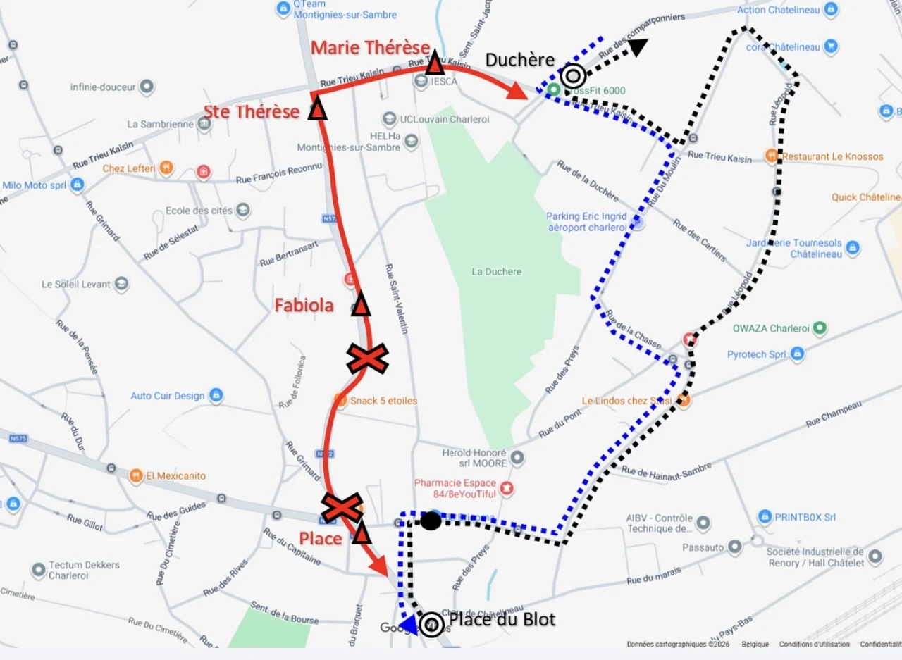 Durant toute la période des travaux, les lignes 1, 3, 11 et 12b seront limitées à l’arrêt Sainte-Thérèse. Ces lignes ne desserviront donc plus le centre de Montignies-sur-Sambre au-delà de ce point.