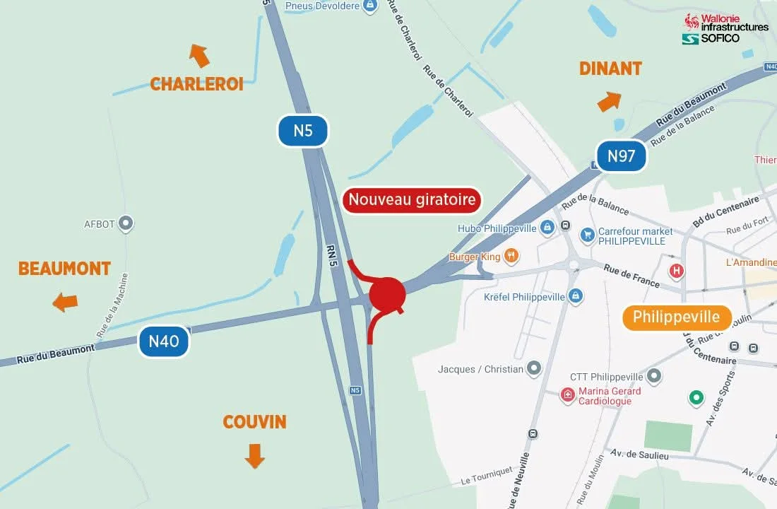Pour ceux venant de la N5 depuis Couvin et empruntant la sortie Philippeville, le virage à gauche vers la N40 en direction de Beaumont sera temporairement interdit. Une déviation par la N97 et la rue de Charleroi permettra de rejoindre la N40.