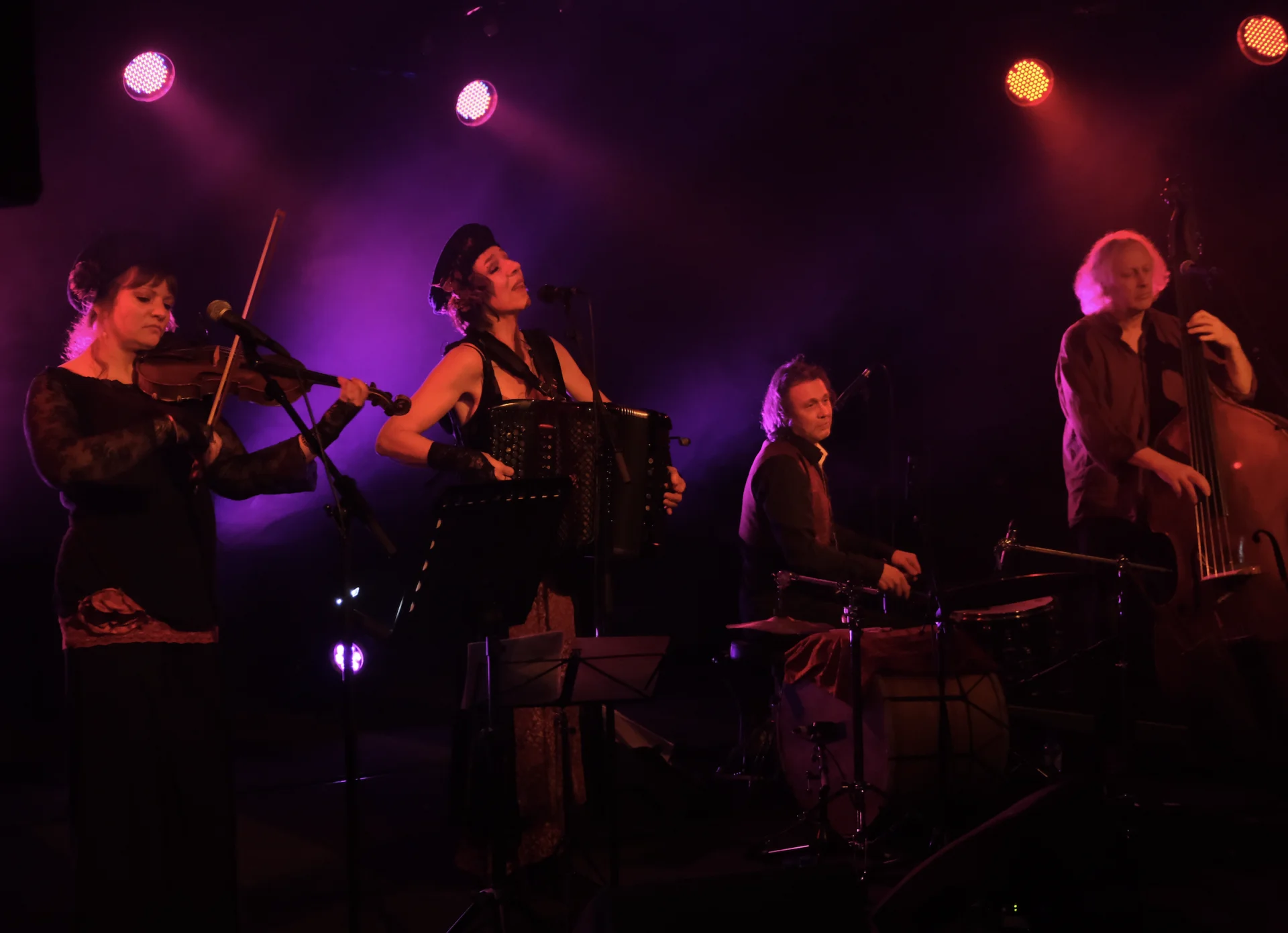 Sur scène, Monique Gelders au chant et à l’accordéon, Aurélie Goudaer au chant et au violon, Alexandre Furnelle à la contrebasse et Stéphane Pougin aux percussions composent un quartet soudé, où la musicalité collective sert pleinement l’intensité du répertoire et la force des traditions revisitées.