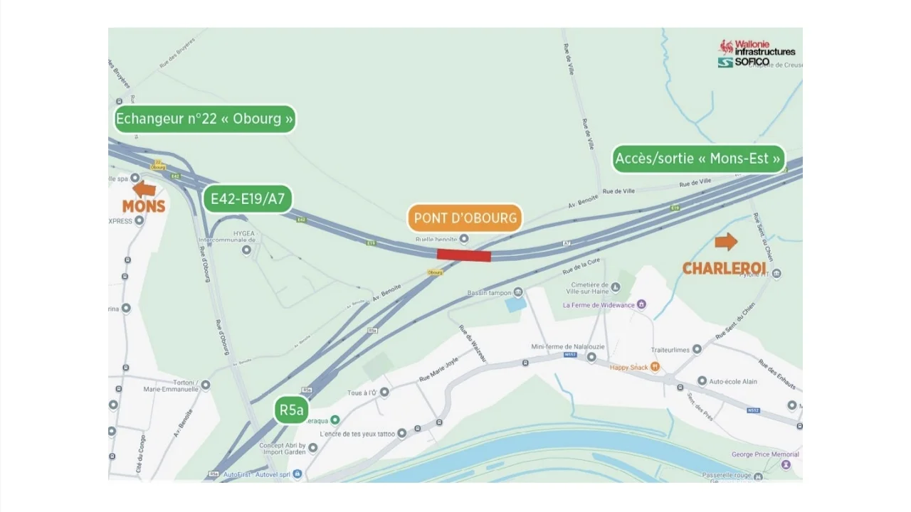 Dans la nuit du 16 au 17 février, l’E42-E19/A7 sera fermée entre 22h et 6h à hauteur du pont. Une déviation sera mise en place via le R5a et la rue d’Obourg pour tous les usagers.