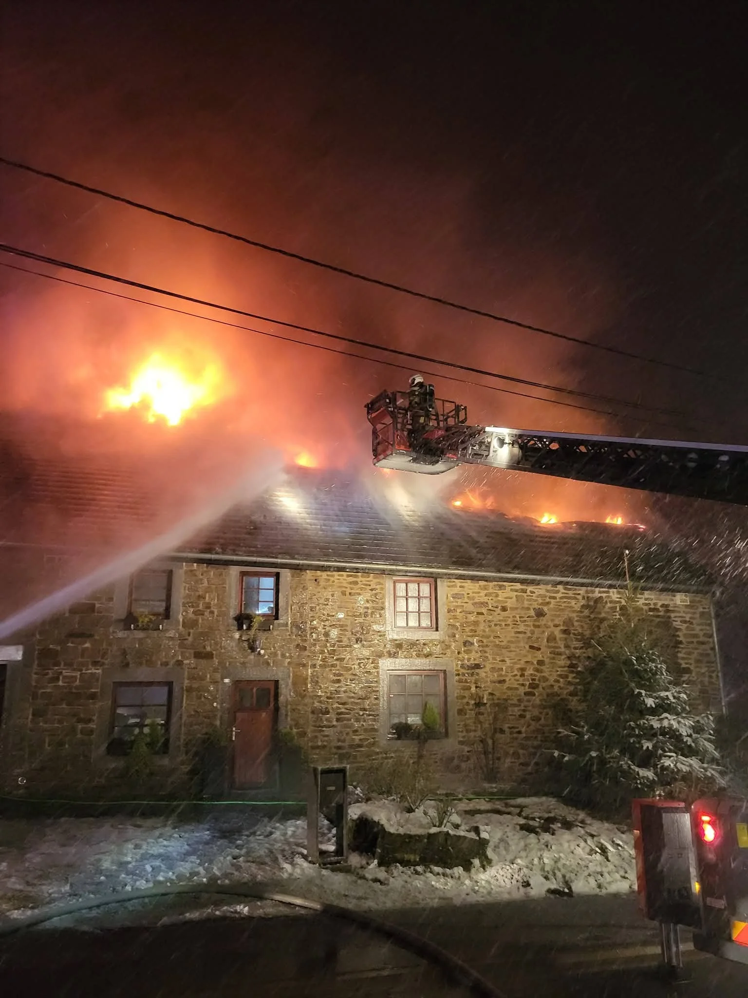 Les pompiers sont intervenus en nombre pour maîtriser le sinistre, malgré des chutes de neige rendant l’intervention plus difficile. La rue a été barrée le temps de l’intervention.
