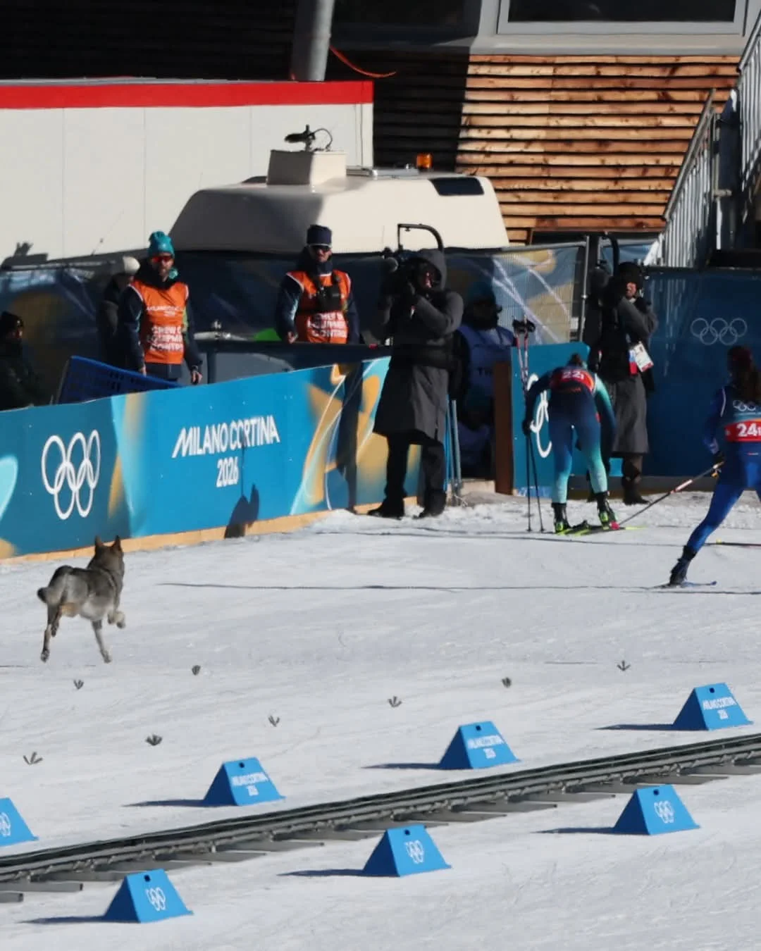 En pleine épreuve du sprint féminin par équipes, le chien a surgi derrière la Grecque Konstantina Charalampidou et la Croate Tena Hadzic, surprenant le public et les officiels