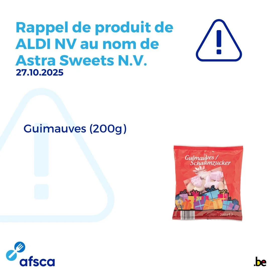 ALDI NV, en accord avec l’AFSCA, annonce le rappel du produit Guimauves 200g distribué par Astra Sweets N.V. Ce rappel concerne le lot LT25249A avec date de péremption 06/2026, vendu entre le 6 octobre 2025 et le 27 octobre 2025.