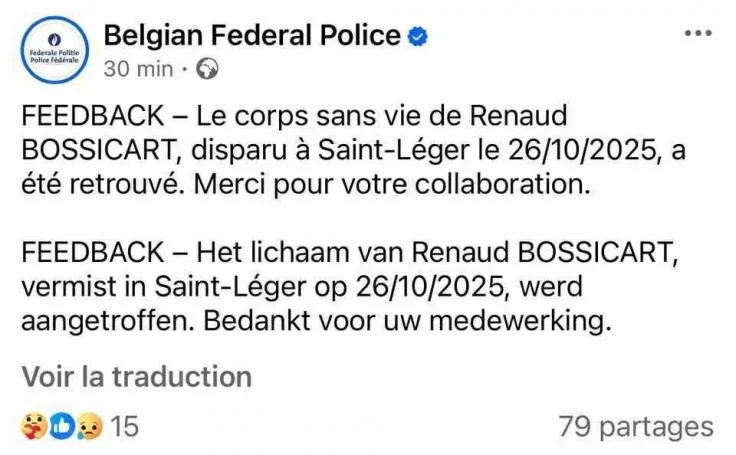 Un drame secoue la commune de Saint-Léger. Le corps sans vie d’un homme âgé de 44 ans, porté disparu depuis samedi soir, a été retrouvé ce dimanche après-midi.