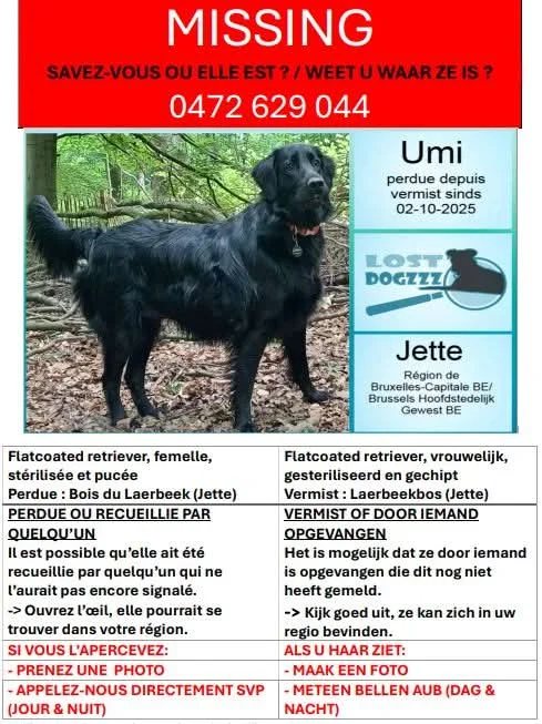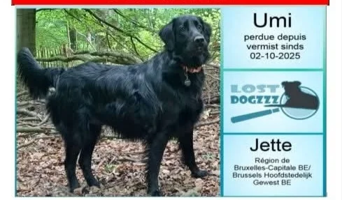 Le 2 octobre dernier, Umi, une retriever flat coated noire âgée de deux ans, disparaissait lors d’une promenade dans le bois du Laerbeek à Jette. L’incident s’est produit aux alentours de 19 heures lorsqu’un cycliste a surpris le chien sur un sentier escarpé. « Le chien a traversé le chemin trop rapidement et ils n’ont pas pu s’éviter », explique Jean-Bernard, le propriétaire. Le cycliste, légèrement blessé à l’épaule, a été pris en charge par les secours, tandis qu’Umi s’est enfuie et n’a depuis donné aucune nouvelle.