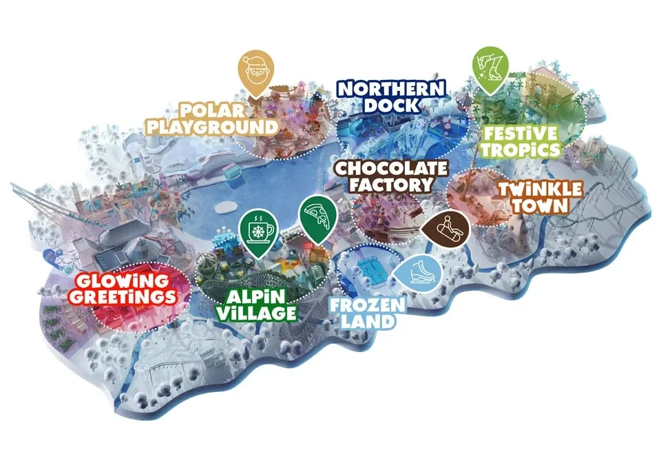 Le parc ne manquera pas de séduire les amateurs de glisse avec Frozen Land, où trônera la spectaculaire patinoire intérieure Crystal Pavillion, s’étendant sur 700 m². Les plus aventuriers se tourneront vers Chocolate Factory, pour une descente en luge inédite sur trois pistes spécialement conçues pour l’occasion.