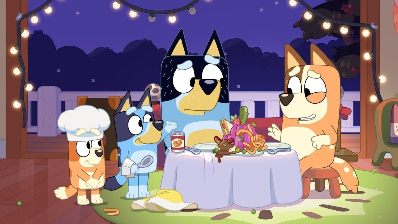07h44–07h45BlueyLes enfants jouent au Café pour que Bingo puisse manger du Pavlova. Mais Papa, le chef cuisinier, ne semble pas comprendre la commande. Quand Bluey le renvoie, Papa installe son p…