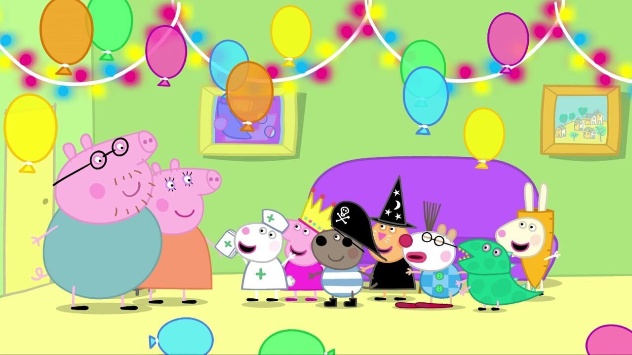 Peppa et George organisent une fête déguisée. Ils ont invité tous leurs amis. Peppa a un costume de princesse, tandis que George, lui, est un effrayant dinosaure. Suzy a revêtu un…
